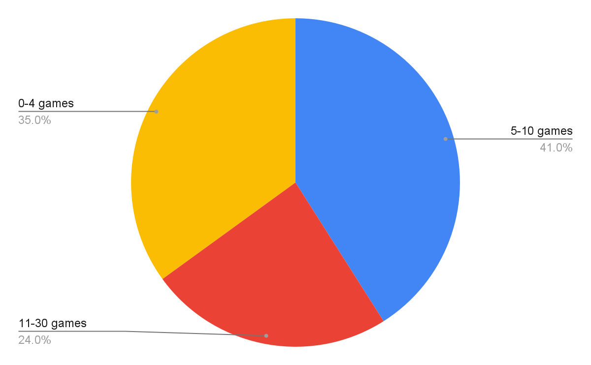 如果我们仔细观察受访者每年购买的游戏数量，就会发现在过去的一年中，大多数游戏玩家 (41%) 购买了五到十个新游戏或扩展包。 不到四分之一 (24%) 的人购买了 11 件或更多，其中 27% 的人购买了 30 件以上。大约 35% 的受访者购买了 4 件或更少。