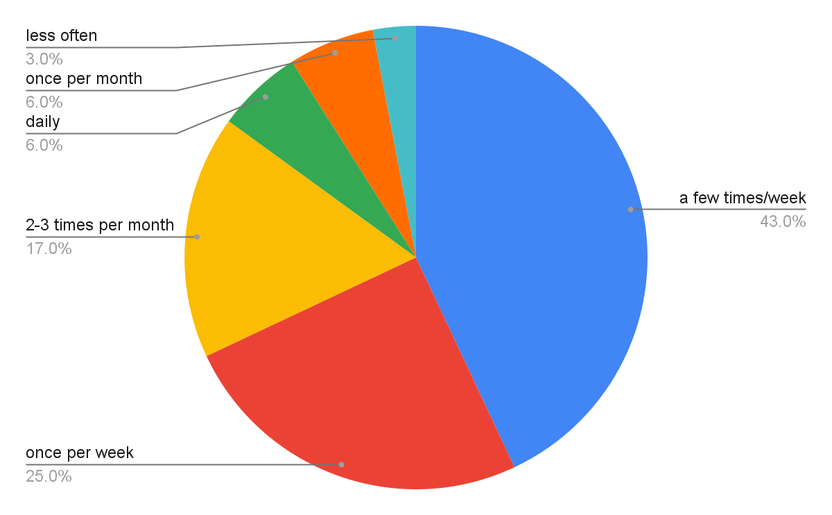 就频率而言，大多数受访者 (43%) 能够每周至少几次将游戏融入他们的日程安排中。 剩下 25% 的人每周玩一次，而 17% 的人每月玩两到三次。 大约 6% 的爱好者每天都会玩，而另外 6% 的人每月只能挤一会。 3% 的人玩游戏的频率低于这个数字。