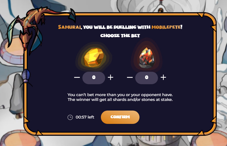 Danach macht derjenige, der später neben dem anderen stand, einen Einsatz und kann wählen, wie viele Scherben (nicht mehr als er hat und nicht mehr als 50) und Steine (maximal einer, und der Angreifer muss ihn haben) wetten möchten. So sieht das Fenster von der Seite des Angreifers aus: