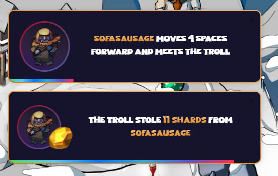 <figure><img src="https://files.gitbook.com/v0/b/gitbook-x-prod.appspot.com/o/spaces%2FaJbUGSBf7SQ1cteREBpv%2Fuploads%2F2G58uYI8WkEZgpcVyiUh%2Fimage.png?alt=media&#x26;token=3a16fdd7-c6ee-4a17-8f6a-abd93e4291a3" alt=""><figcaption><p>プレイヤーはトロルのスペースに立って、11 個のシャードを失いました</p></figcaption></figure>