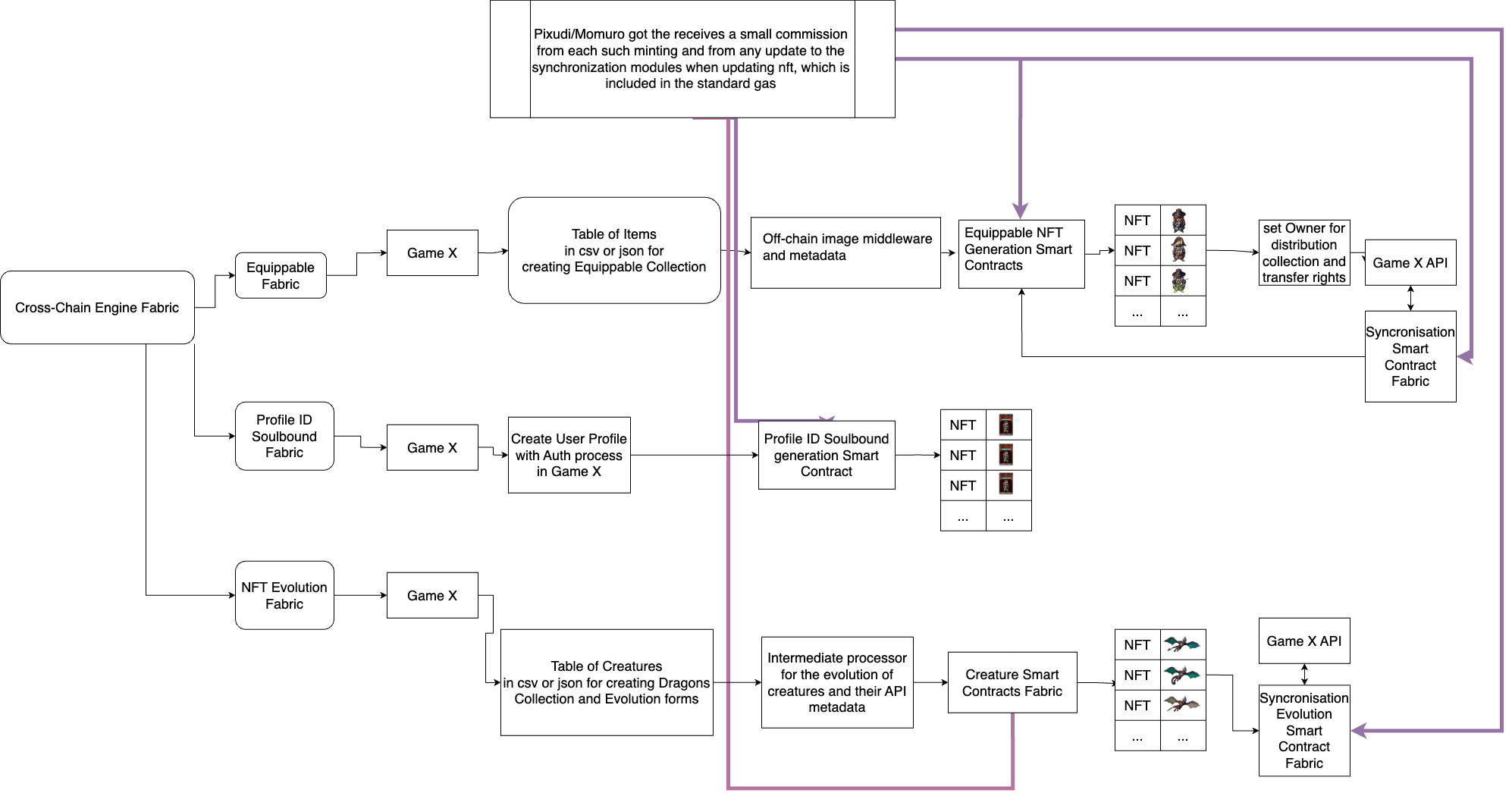 Sự lựa chọn thứ hai: bằng cách sử dụng nhà máy và API của chúng tôi, người dùng không có kiến thức kỹ thuật phức tạp sẽ có thể tích hợp các hợp đồng thông minh của chúng tôi bằng API. Momuro nhận được một khoản hoa hồng nhỏ từ mỗi hành động như đúc tiền và từ bất kỳ cập nhật nào đến mô-đun đồng bộ hóa khi cập nhật NFT, được bao gồm trong gas tiêu chuẩn