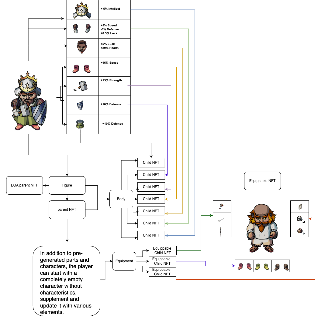Tổng của tất cả các đặc điểm được cộng lại và có thể được phản ánh dưới dạng siêu dữ liệu. Đặc biệt, NFT này chỉ có một nội dung duy nhất - chính danh mục có thể trang bị được. Giá trị danh mục đề cập đến ID của siêu thực thể Danh mục, trường id được sử dụng để lập chỉ mục và có thể nhắm mục tiêu một nội dung cụ thể khi muốn thay thế, chấp nhận hoặc xóa nó, trong khi chờ xử lý sẽ cho chúng tôi biết liệu chủ sở hữu NFT có đã chấp nhận tài sản này.